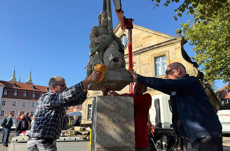 Nachdem die Stadtwerke-Monteure eine Undichtigkeit an der Figur festgestellt hatten, musste der beliebte Brunnen zunächst außer Betrieb genommen werden. Im Frühsommer haben die Stadtwerke den Brunnen gemeinsam mit Steinmetzmeister Konrad Götz abgebaut.