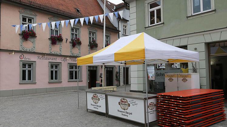 Das Festzelt am Leinritt steht seit einigen Tagen und fast alle der 4000 Wimpel hängen schon über den Straßen. Auch die ersten "Festgäste" haben, wie etwa am Kranen, die aufgestellten Biertischgarnituren entdeckt und für sich erobert. Zwar gab es dort weder Bier noch Bratwürste oder Fisch, aber eine "kostenlose" Sitzgelegenheit mit Aussicht auf das Festzelt und Klein Venedig.
