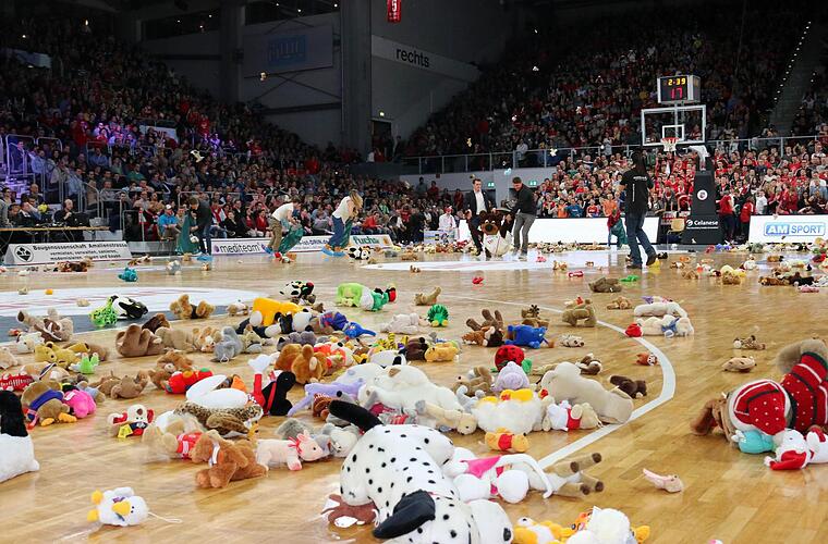 Beim Stand von 15:12 für die Brose Baskets und der ersten Auszeit 2:39 Minuten vor Ende des ersten Viertels war es soweit: Über 30 Sekunden lang regnete es Plüschtiere in der Brose Arena. Und gut zwei Minuten später war der Spuk auch schon wieder vorüber. Bären, Zebras, Schafe, Haifische und anderes Getier waren vom Spielfeld gekehrt und warteten, in große Tüten gepackt, auf den Abtransport.