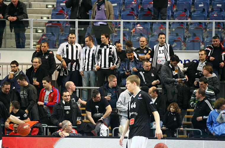 Auch während des Spiels fiel ein Belgradfan unangenehm auf. Gegen Ende der regulären Spielzeit warf er einen vollen Plastikbecher auf das Spielfeld, traf jedoch nichts als den Hallenboden. Die Polizei war auch hier sofort zur Stelle und zog den Jugendlichen aus dem Fanblock.