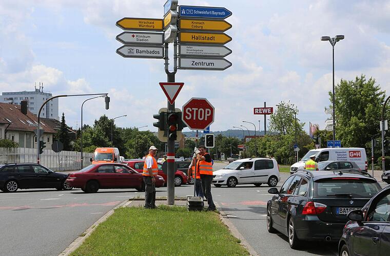 Die Behelfsampel an der Kreuzung Memmelsdorferstraße/Berliner Ring wird Mittwochmittag für zwei Stunden abgeschaltet, weil Steuerelemente in die neue Ampelanlage eingebaut werden.