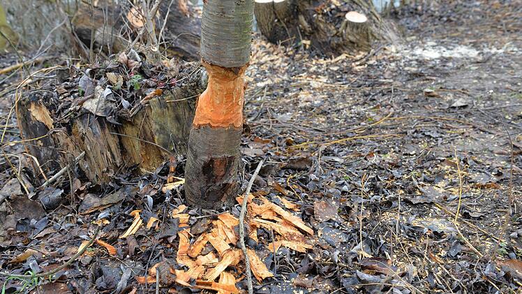 Derzeit sind die Spuren der Nagetiere auf der Erbainsel im Bereich der Regnitz deutlich zu sehen. Das Gartenamt schützt nun einige Bäume mit kleinmaschigem Hasenzaun.