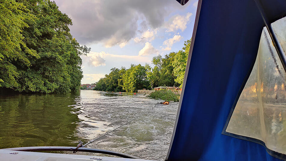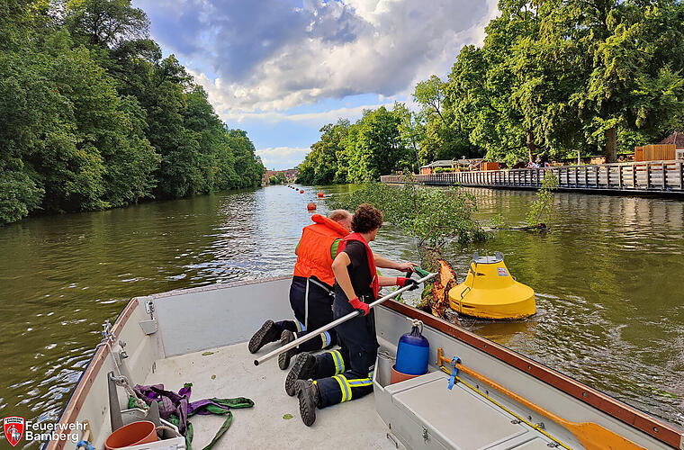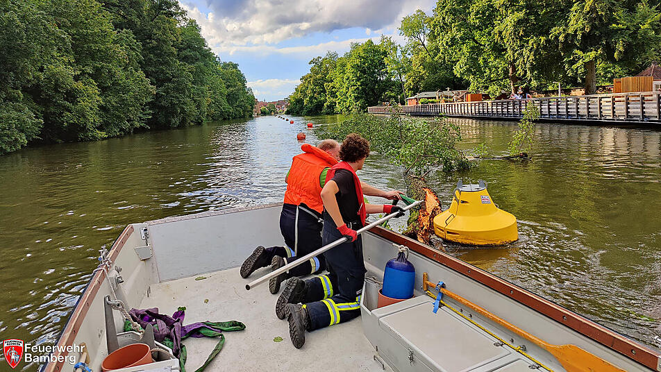 "Am Nachmittag wurde die Feuerwehr Bamberg ins Haingebiet alarmiert, um einen großen Baum zu sichern, der oberhalb der Hainbadestelle ins Wasser gestürzt war und im Begriff war abzutreiben", erklärt die Bamberger Feuerwehr. Es hätten demnach nicht nur Schäden an der Hainbadestelle, sondern auch an der Fähre auf Höhe der Villa Concordia und der Kraftwerksanlage Obere Mühlbrücke gedroht.