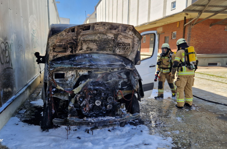 Rabenschwarz ist jetzt die Front eines Lieferwagens, der in der Böttgerstraße in Bamberg geparkt war. Am Samstagnachmittag (2. September 2023) um 14.25 Uhr erhielt die Feuerwehr Bamberg einen Alarm über ein brennendes Fahrzeug.