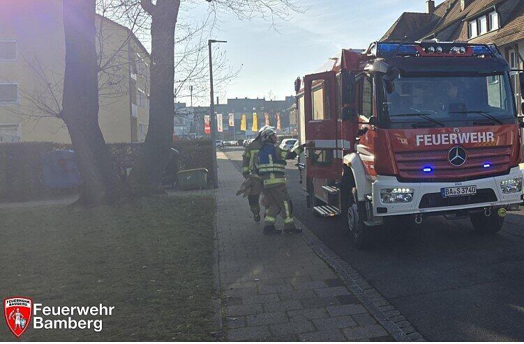 Feuerwehrleute sind an der Pödeldorfer Straße in Bamberg im Einsatz. Bewohner eines Hauses hatten die Einsatzkräfte wegen eines piepsenden Rauchmelders in einer Wohnung alarmiert.