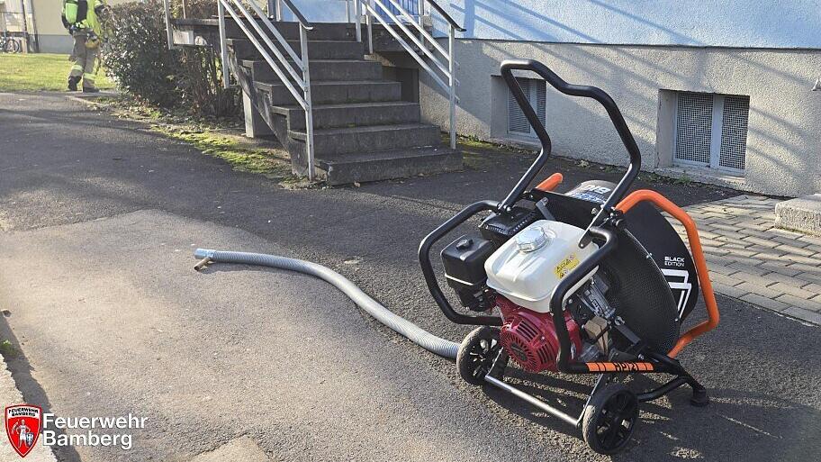 Ein Überdrucklüfter steht vor einem Haus an der Pödeldorfer Straße in Bamberg. Bewohner eines Hauses hatten die Feuerwehr wegen eines piepsenden Rauchmelders in einer Wohnung alarmiert.