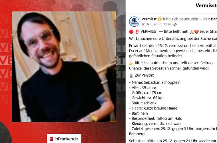 Im Bereich Bamberg läuft seit rund anderthalb Wochen eine Öffentlichkeitsfahndung nach einem 39-jährigen Mann namens Sebastian Schöpplein. Dieser wird seit dem 25. Dezember 2025 vermisst. Zuletzt wurde er am frühen Morgen des ersten Weihnachtsfeiertags gegen 3 Uhr in der Bamberger Sandstraße gesehen. Die Polizei hat seitdem verschiedene Suchaktionen durchgeführt - einschließlich eines Taucheinsatzes von Spezialkräften im Main-Donau-Kanal. Neue Spuren ergaben sich hierdurch aber nicht.