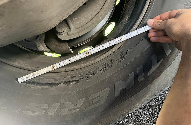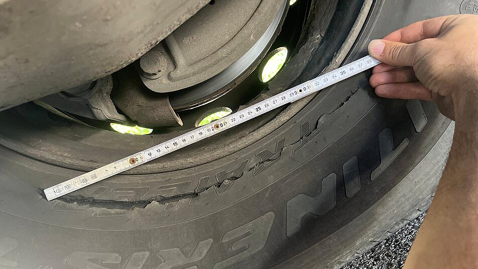 Bei der Kontrolle in Hirschaid stellte sich heraus, dass der 51-Jährige Fahrer nicht nur mit 88 km/h statt den erlaubten 60 Kilometern pro Stunde unterwegs war. An dem Sattelauflieger waren zwei Querträger des Rahmens gebrochen und bereits verrostet. Fünf Reifen des Lasters waren bis tief in die Karkasse beschädigt. Ein Riss hatte eine Schlitzlänge von über 30 Zentimetern, wobei die Karkasse bereits durchgebrochen war. Ein Reifenplatzer stand unmittelbar bevor, so die Polizei.