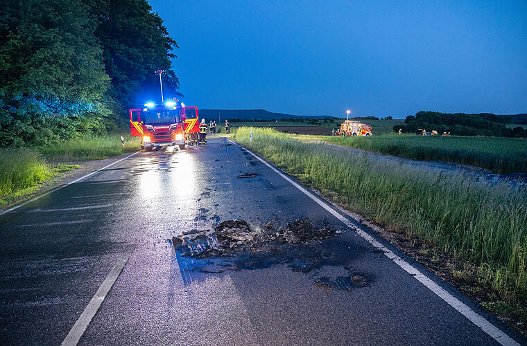 Das brennende Fahrzeug rollte anschließend noch etwa 100 Meter weiter, bevor es in einem Acker zum Stehen kam. Einsatzkräfte der Feuerwehr mussten nicht nur das Auto ablöschen, sondern auch auf dem Weg in Brand geratene Grünfläche.