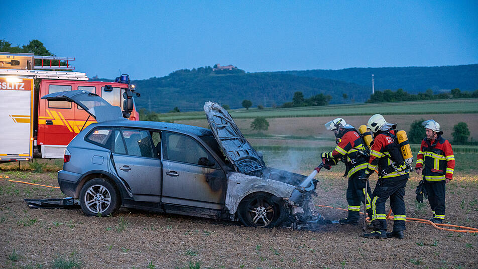 Auf einer Straße im Landkreis Bamberg gerät ein Auto in Brand und rollt anschließend noch mehrere Meter weiter. Die beiden Insassen bleiben glücklicherweise unverletzt.