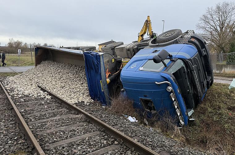 Im Kreis Bamberg ist am Freitag ein voll mit Schotter beladener Sattelzug umgekippt. Die Ladung verteilte sich auf Bahngleise - die betroffene Strecke musste gesperrt werden.