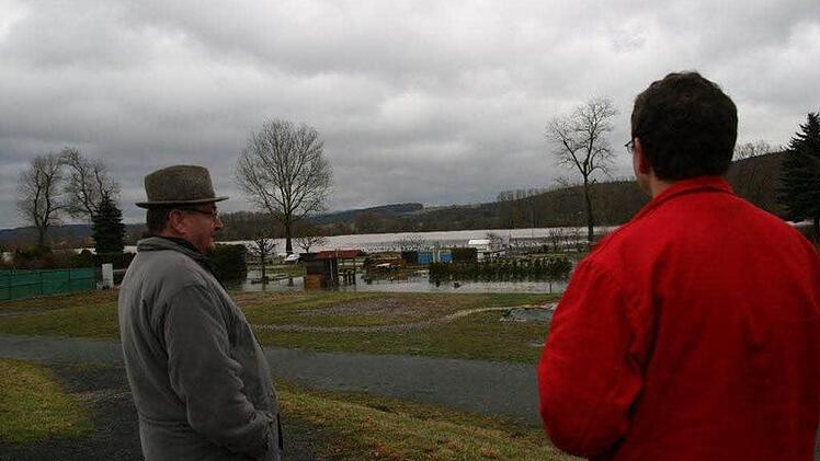 Anlieger Jakob Schlichtig und Dritter Bürgermeister Hans-Jürgen Scheerbaum befinden von der Dammkrone aus: "Keine Gefahr!" Zwar ist wieder einmal der Ebinger Campingplatz überflutet, aber das trifft wohl nur einen Camper hart: Sein zurückgelassener Wohnwagen bekommt langsam einen nassen Bauch. Ansonsten schätzt man sich in Ebing endlich auf der sicheren Seite. "Gott sei Dank", sagt Scheerbaum.