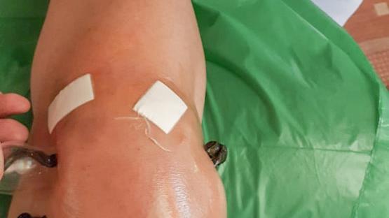 Ja, es ist schmerzhaft und ja, das ist auszuhalten. Etwa 45 Minuten saugten die Viecher an meinem Knie, bis sich einer nach dem anderen fallen ließ. Pappsatt und rülpsend, nehme ich an, denn nach dieser Mahlzeit würden die Blutegel etwa ein Jahr lang keine weitere Nahrung mehr benötigen, sagen Biologen. Und sofort, nachdem die Tiere das Saugen eingestellt hatten, rann Blut aus den vier Wunden. Klar: Der Wirkstoff Hirudin verhindert noch Stunden später, dass sich die Wunde verschließt.