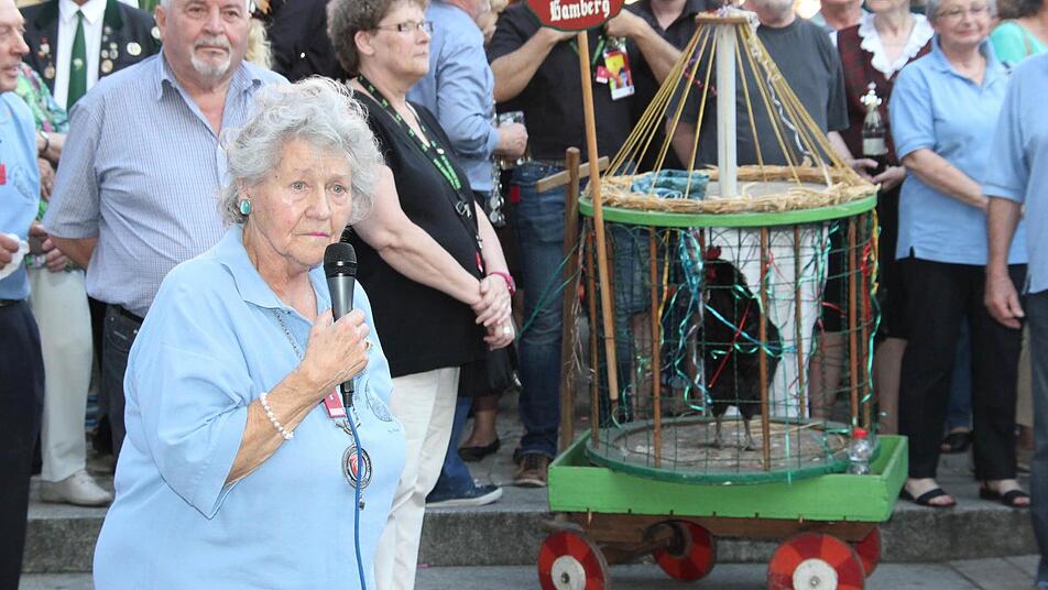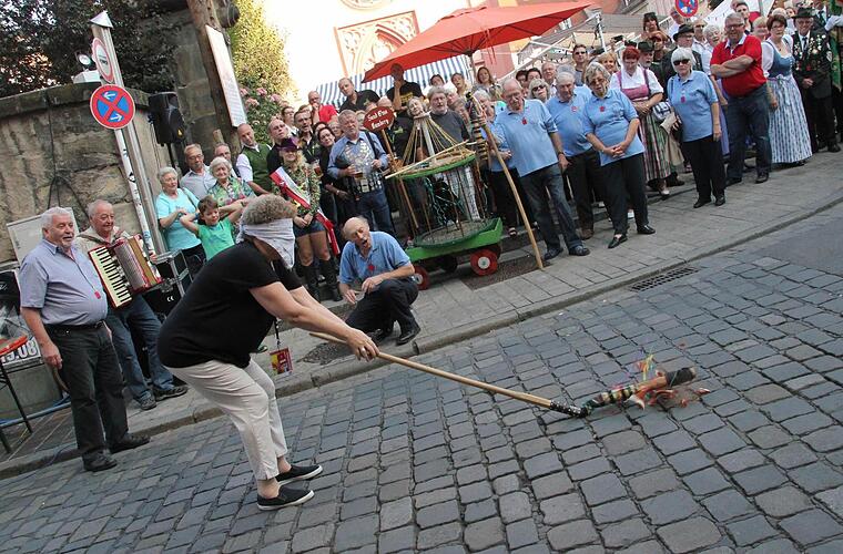 Der Hahnenschlag war am letzten Tag der Sandkerwa in Bamberg so schnell zu Ende wie lange nicht. Gisela Bosch hatte den Tontopf zielgenau getroffen.