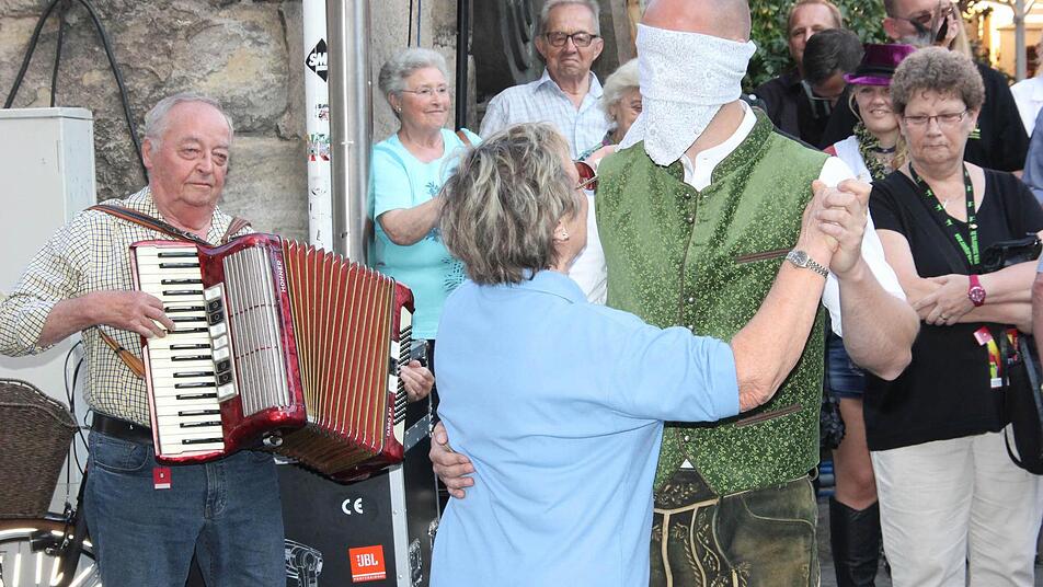 Er musste natürlich der Tradition nach erst einmal mit verbundenen Augen tanzen.
