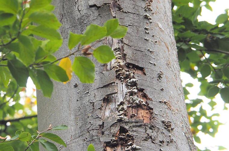 Beim Vor-Ort-Termin im Hain machte sich auch Klimareferent Jonas Glüsenkamp (Grünes Bamberg) ein Bild von der dramatischen Situation. "Der Klimawandel ist nicht Zukunft, sondern ist heute in Bambergs grüner Stube, im Hain, sichtbar", sagt der Zweite Bürgermeister. Dabei sei eine Art Kettenreaktion festzustellen: Die in den vergangenen Jahren entstandenen Lücken im Baumbestand hätten zur Folge, dass die zuvor beschatteten glatten Stämme und Äste der Buchen nun der prallen Sonne ausgesetzt sind. Die Stämme würden durch die intensive Sonneneinstrahlung geschädigt. Es bildeten sich oft sogenannte "Sonnenbrand-Rindennekrosen". Diese vorgeschädigten Stämme werden dann wiederum durch holzbrütende Insekten oder Pilze befallen, sterben ab - und die Lücken im Hain werden noch größer.
