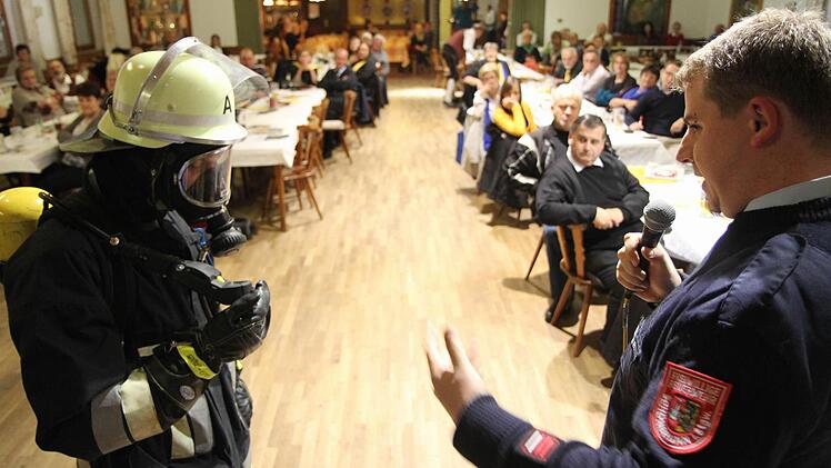 Vier Bundeskegelbahnen Der Kegelabteilung im Schützenverein stünden vier Bundeskegelbahnen zur Verfügung. Von insgesamt fünf Teams trugen die Senioren im letzten Jahr die Deutsche Meisterschaft nach Hause. Aber auch Kegeln im Saal ist möglich - und es ist vor allem lustig. Als Spieler mussten Anette Schreiber, Bürgermeister Hollet und Pfarrer Bernhard Friedmann antreten. Unter den Anfeuerungsrufen der Zuschauer schlugen sich alle wacker, "abgeräumt", das heißt alle Neune umzuwerfen, schaffte jedoch keiner. Nachwuchsprobleme plagen auch die Schönbrunner Feuerwehr, eine Stützpunktwehr, die sogar eine Damengruppe vorweisen kann. Was ein Atemschutzgeräteträger so alles tragen muss, demonstrierten Kommandant Matthias Hümmer, Bernd Willuhn und der Vorsitzende Matthias Fröhling. Die Spezialkleidung müsse schließlich Temperaturen bis zu 600 Grad standhalten. Pascal Berlinger zog die Ausrüstung an, zu der das etwa zwölf Kilo schwere Atemschutzgerät gehört, dessen Luft für etwa eine halbe Stunde ausreicht. "Wir sind an 365 Tagen im Jahr im Einsatz und machen einfach alles", betonte der Kommandant. Derzeit sei die Feuerwehr mit der Planung für ihr neues Haus beschäftigt.