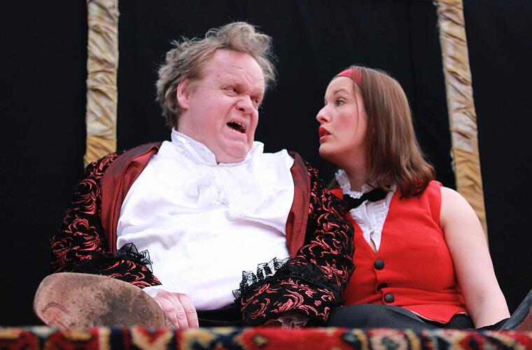 Es ist ja nicht leicht, ein 400 Jahre altes Stück mit fürs zeitgenössische Publikum sperriger Sprache in eine rustikale Freilicht-Produktion zu transponieren, nicht mit den Mitteln eines großen Hauses hinter sich, und trotzdem als künstlerisch einigermaßen anspruchsvoller Regisseur am Morgen noch ohne Beschämung in den Spiegel schauen zu können. Peter Kempkes ist dies, meist, gelungen. Er verantwortet in der fränkischen Version von "Was ihr wollt" auch noch das Bühnenbild und die Text-Bearbeitung, und zu all dem spielt er den Herzog Orsino und den Höfling Andrew von Bleichenwang.