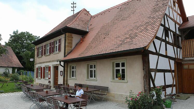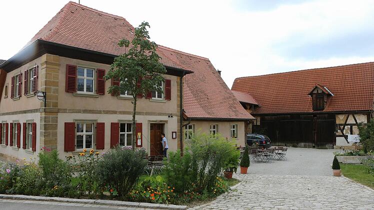 Und man kann hier einkehren, der Aufenthalt in dem Wirtshaus wird zur rustikalen Zeitreise. Gemütliche, fränkische Gastlichkeit unter der Balken-Bohlen-Decke aus dem Jahr 1715, handwerklich gearbeitete Dielen- oder Terazzoböden, Schablonenmalerei an den Wänden, illuminiert von Wandleuchten aus Großmutters Kindertagen (um 1910/20). Davor ein sehr interessantes, historisch gewachsenes Hofgefüge.