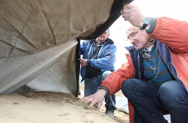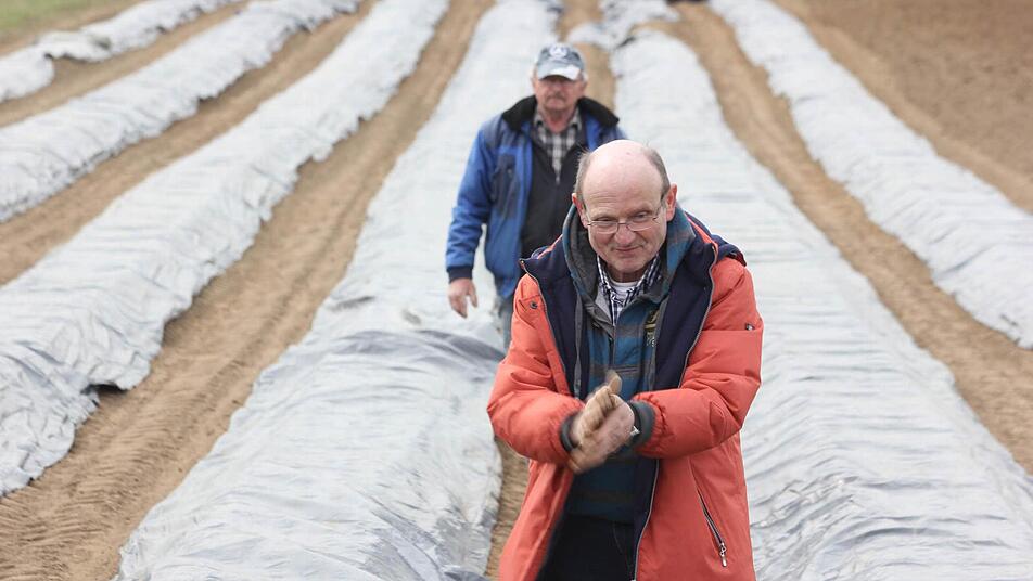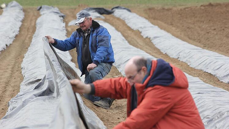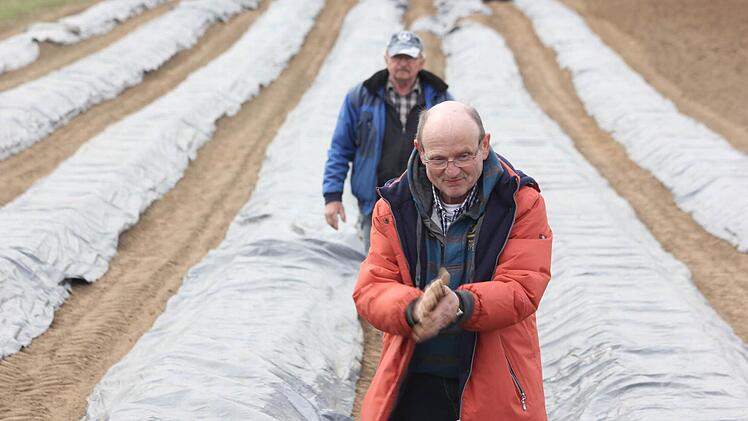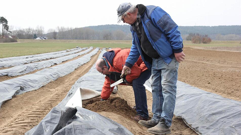 Keine Sorge um Ertrag Um den Ertrag dieser Saison machen sich Hans Ott und Alois Büttel von der Spargelgemeinschaft Hirschaid trotz des langen Winters keine Sorgen. "Der Spargel kommt, das ist sicher", sagt Ott. Kollege Alois Büttel fügt hinzu: "Wenn die Saison etwas später losgeht, hört sie halt auch etwas später auf."