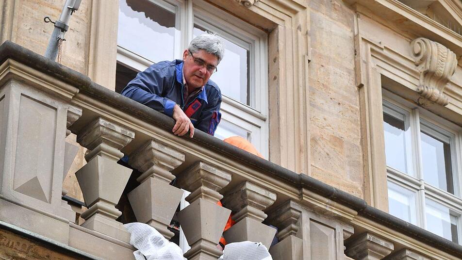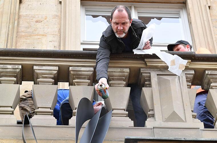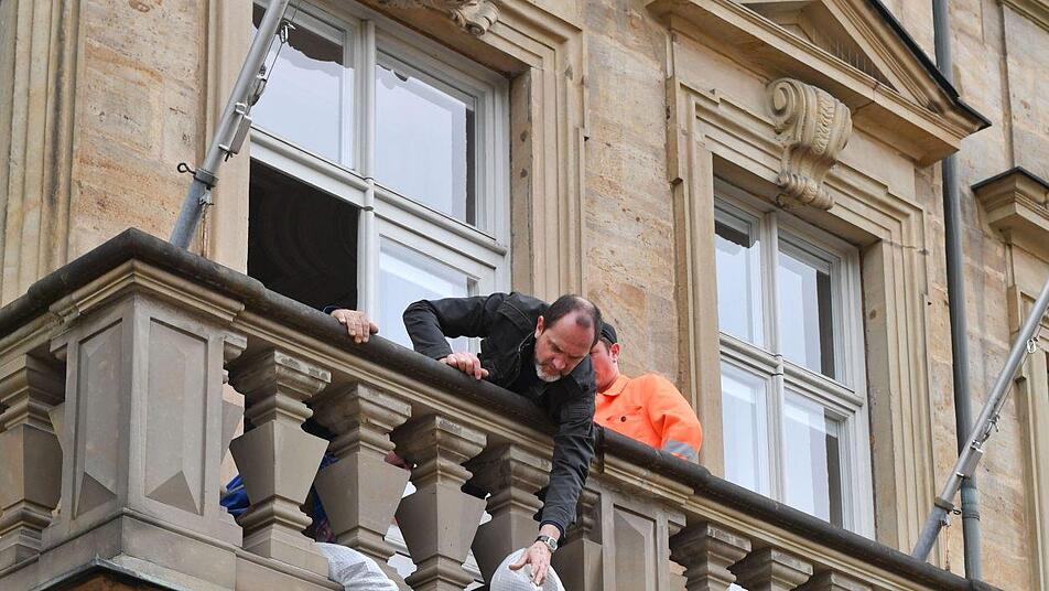 Immer wieder wird die lange Leiter neu am Balkon des Rotenhan-Palais in der Kapuzinerstraße angesetzt. Gerade so reicht sie bis nach oben. Rui Chafes beobachtet die Situation. Von unten an der Straße, von oben auf dem Balkon. Noch liegt seine Plastik eingepackt auf der Ladefläche eines Transporters, gleich soll sie über die Leiter hoch auf den Balkon. Sein Blick wirkt sorgenvoll. Hat er Angst um sein Werk? "Nein, keine Angst", sagt Chafes. Aber eine genaue Vorstellung: "Wir müssen immer aufpassen, dass alles so gemacht wird, wie es gedacht ist. Es geht um eine gewisse Präzision und Perfektion."
