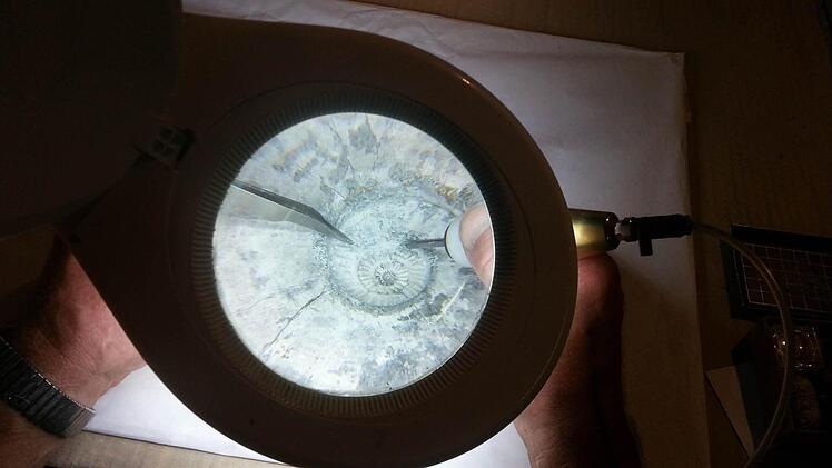 "Die Grube hat es in sich", sagt er. Etliche seiner Fundstücke hat er hier gesammelt. Doch angefangen hat seine Sammelleidenschaft in Unterstürmig bei Eggolsheim (Landkreis Forchheim). Mit Sohnemann Andreas hat er damals, 1994, einen Ausflug gemacht. Der kleine Bub hat in der Liasgrube einen Ammoniten gefunden, der "einfach so" auf dem Boden lag.