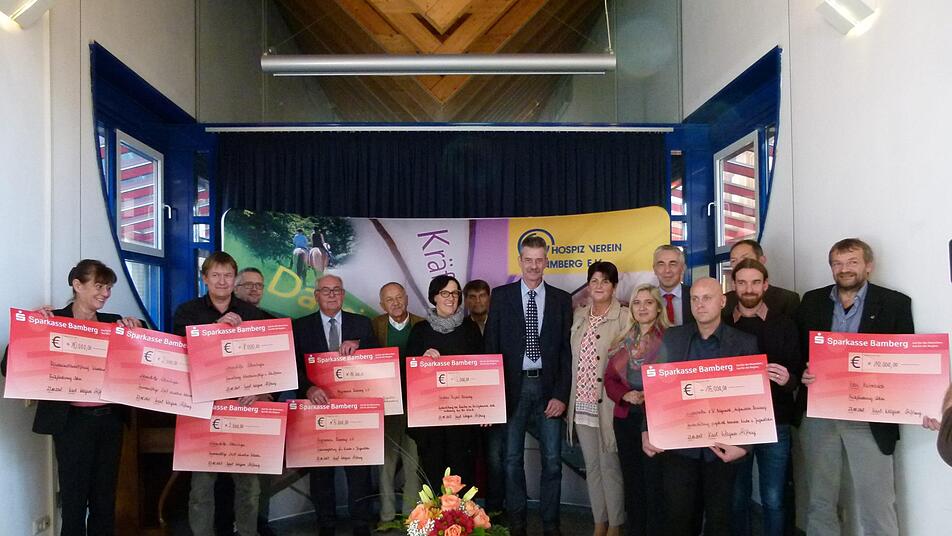 Mit 20 000 Euro erhielt der Hospizverein Bamberg - vertreten durch Vorsitzenden Konrad Göller als Gastgeber des Aktes - die größte Summe. 15 000 Euro sind für das Kümmern um Kinder und Jugendliche mit lebensverkürzenden Erkrankungen wie auch deren gesamte Familie gedacht. 5000 Euro sollen in die Weiterbildung ehrenamtlicher Hospizhelfer fließen.Die Harl.e.kin-Nachsorge Bamberg - sie hilft Familien von Frühgeborenen nach der Entlassung aus dem Krankenhaus - erhielt 5000 Euro, der Kinderseelen e.V. - Förderverein der Kinder- und Jugendpsychiatrischen TagesklinikBayreuth/Außenstelle Bamberg - 15 000 Euro, die Blindeninstitutsstiftung Würzburg 10 000 Euro, die Frühförderung SEHEN des Bildungszentrums für Blinde und Sehbehinderte Kulmbach 10 000 Euro und die Lebenshilfe Schonungen 12 000 Euro.