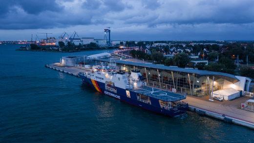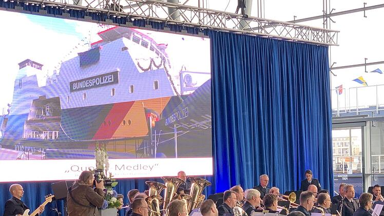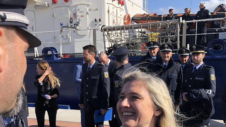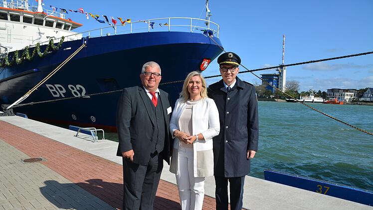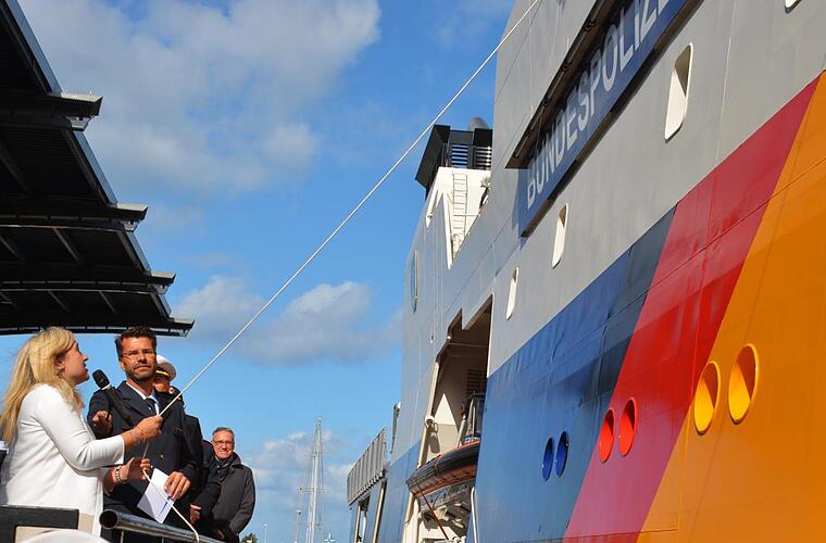 Ministerin Melanie Huml tauft in Warnemünde das neues Einsatzschiff der Bundespolizei.
