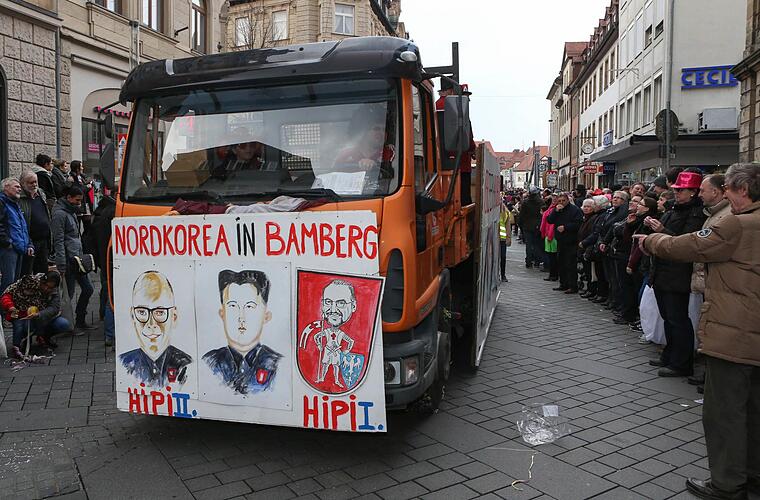Bamberger Faschingsumzug im vergangenen Jahr. Er hatte auf einem Plakat den damals noch amtierenden Bürgermeister Werner Hipelius und seinen Sohn Stefan (CSU) mit dem nordkoreanischen Diktator Kim Jong Un, der seinen Vater beerbte, in Verbindung gebracht (siehe Bild).