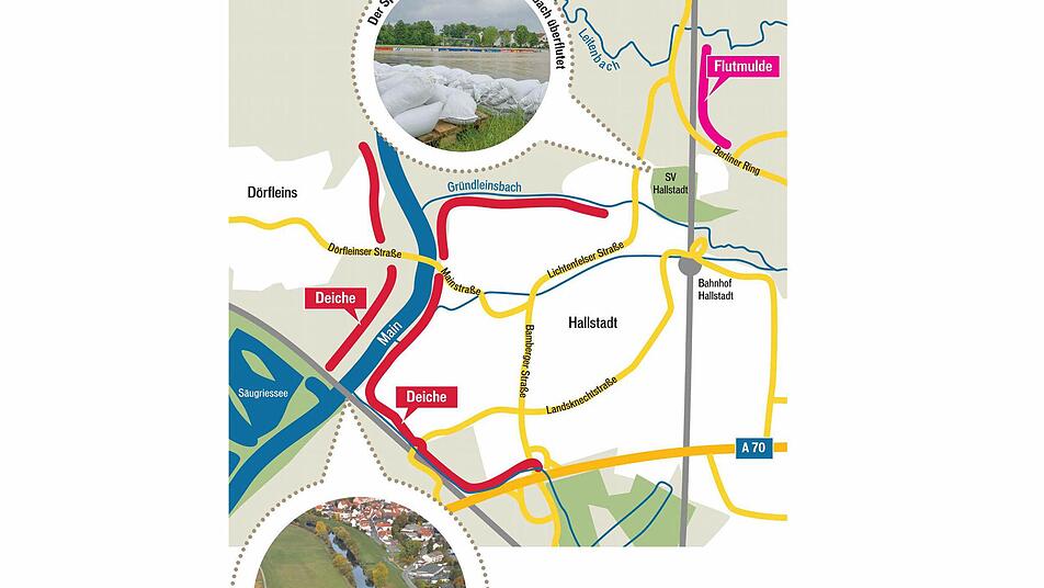 Bei der geplanten Verbesserung des Hochwasserschutzes geht es vor allem um den Bereich zwischen der Mainbrücke nach Dörfleins und der Achterbrücke. Einbezogen ist aber auch der Gründleinsbach, der erst beim jüngsten Hochwasser den Hallstadtern große Sorgen bereitete.