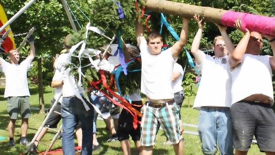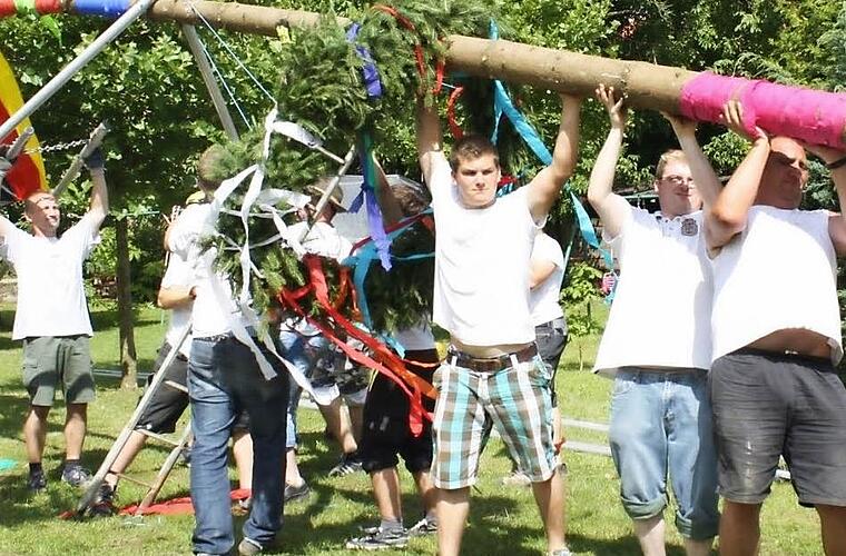 Trotz des schwülwarmen Wetters schafften die Jungs vom Hüttla und der Ponderosa den Kraftakt des Baumaufstellens problemlos.