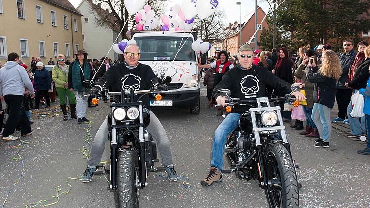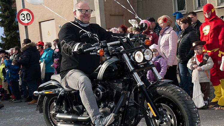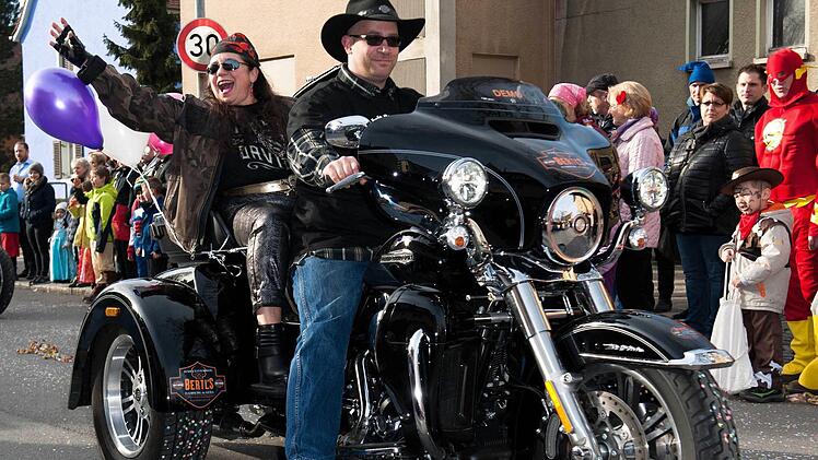 Bleibt nur noch die Frage, warum BuB-Vorsitzende Daniela Reinfelder nicht neben ihren Parteifreunden hoch oben auf ihrem Wagen thronte. War sie gar erkrankt? Mitnichten: Sie fuhr als wilde Bikerin im Pulk mit weiteren "Rockern" voraus auf dem Soziussitz einer "heißen" Harley Davidson. Wild, wild West Fasching eben ...