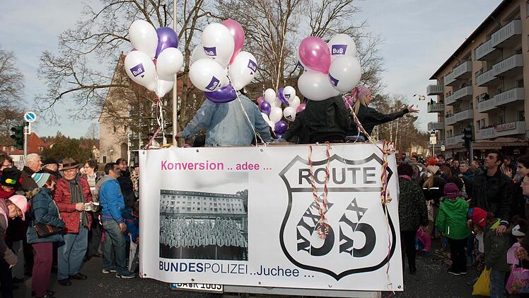"Wir haben in diesem Jahr noch mehr Zeit in die Gestaltung des Wagens investiert. Allein die XXL-Polizeimütze kostete einige Abende - zumal der Fasching heuer extrem kurz war und wir dadurch fast etwas unter Zeitdruck gerieten", schilderte Bürgervereinsvorsitzender Matthias Neller. Er bedauerte, dass die Stadtspitze in Sachen Konversion regelrecht überrollt worden sei. Da sei manch einer auch etwas blauäugig gewesen. Dennoch sei man seitens des Bürgervereins mit dem Spruch "Sorry! Wir hatten keine Chance" aber doch fair geblieben. "Außerdem ist die Bundespolizei bei uns in der Gartenstadt herzlich willkommen", betonte Neller.