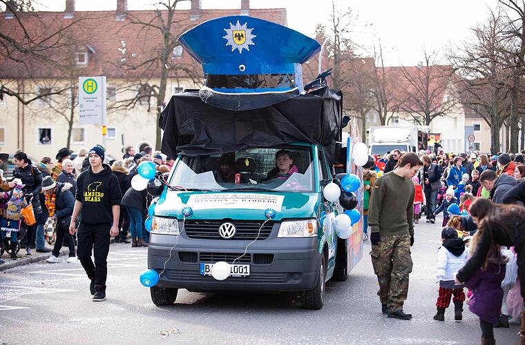 Ein echter Hingucker war einmal mehr der Wagen des Bürgervereins Gartenstadt. Mit einem aufwendig gestalteten Gefährt nahmen sie die Konversion auf die Schippe. Dabei "verwandelten" die Narren unter anderem Bundeskanzlerin Angela Merkel (CDU), Finanzminister Wolfgang Schäuble (CDU) und Bundesinnenminister Thomas de Maizière (CDU) in ein Police-Acadamy-Team, das sich Bamberg unter den Nagel reißt.