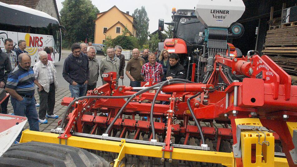 Als erstes steuerte der Bus den Betrieb von Jörg Deinlein in Neudorf bei Scheßlitz an. Deinlein betreibt den Hof zusammen mit seinem Bruder Andreas. Außer der Landwirtschaft halten sie Muttersauen und haben eine Biogasanlage. Thema seines Vortrages war die "Landwirtschaft 4.0" mit den Teilbereichen Ertragskartierung, Präzisionspflanzenanbau und den damit einhergehenden positiven Effekten für den Landwirt und die Umwelt.