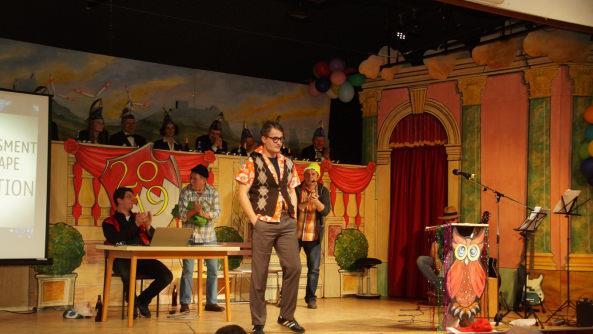 Der rasende Reporter (Matthias Rauch) brachte brandneue Breaking-News. Da TSV-Vorstand Rainer Kretschmer nun im Ruhestand sei, werde vermutlich die Raumtemperatur im Saal wieder steigen. Auch dass das Seifenkistenrennen der Krona Internationale ausgerechnet die Schmittbräu gewonnen habe, war ihm eine Pressemitteilung wert. Mit Stolz aber wurde verkündet, dass mit Sebastian Dippold Deutschlands bester Bierbrauer aus Scheßlitz komme, genauer hätte es heißen müssen aus Merkendorf.