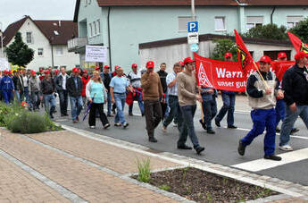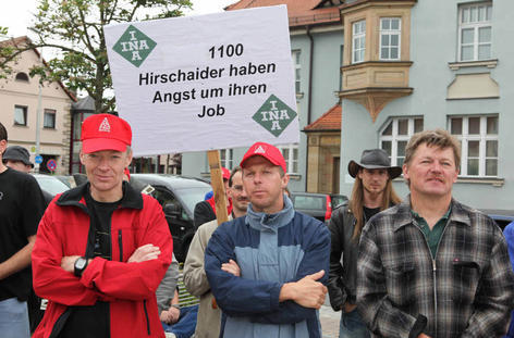 Am Rathaus legte der Demonstrationszug einen Zwischenstopp ein, zu einer kleinen Kundgebung. „Betriebsbedingte Kündigungen zu verhindern war ein harter Kampf, dennoch sind die Arbeitsplätze alles andere als gesichert“, warnte Rainer Wacker, Zweiter Bevollmächtigter der IG Metall Bamberg. Schließlich habe das Hirschaider Management angekündigt, dass 128 Arbeitsplätze in Gefahr seien. Ferner, so schimpfte Wacker weiter, sei es „glatte Erpressung“, von den Beschäftigten zu verlangen, dass sie bis 2010 beispielsweise durch Kurzarbeit und Lohnverzicht 7,2 Millionen Euros einsparen sollen.