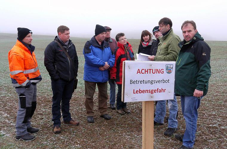 Betreten verboten: Robert Prell, Dietmar Schnapp, Theo Böhmer, Heinrich Böhmer, Cornelia Meixner, Manuela Krauß, Christian Weyer, Jürgen Finkel und Wolfgang Hornung (von links) wehren sich dagegen, dass sie die Kosten für die Kampfmittelräumung auf ihren Ackerflächen zwischen Unterbrunn und Rattelsdorf übernehmen sollen. Foto: Berthold Köhler