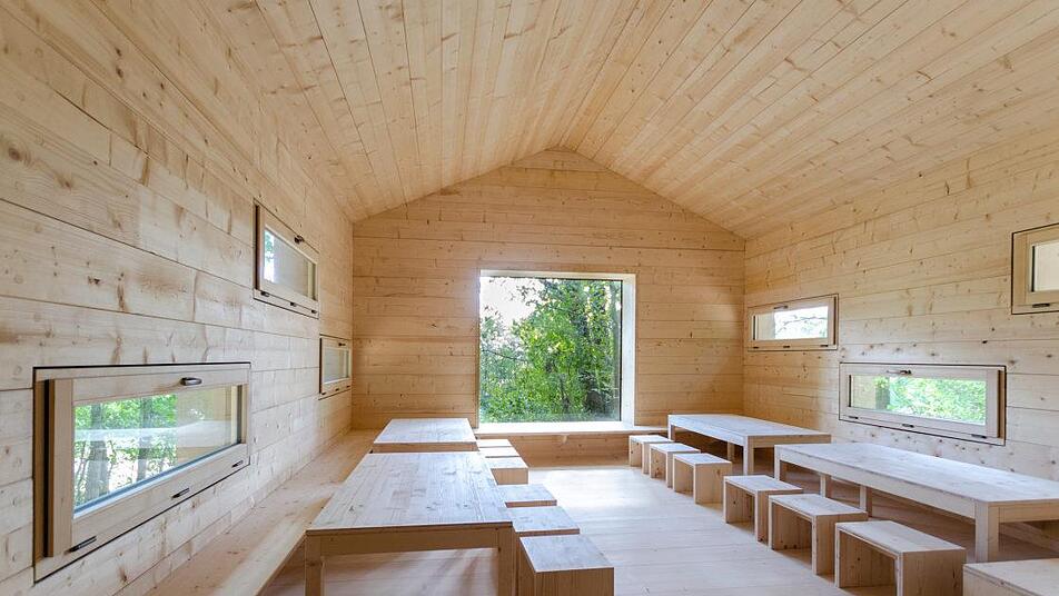 Sollte der Bedarf am Waldkindergarten in Zapfendorf jemals wieder versiegen, dann ließe sich der unter ein schwebendes Ziegeldach gestellte Holzständerbau kinderleicht für eine andere Nutzung umwidmen.