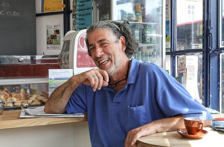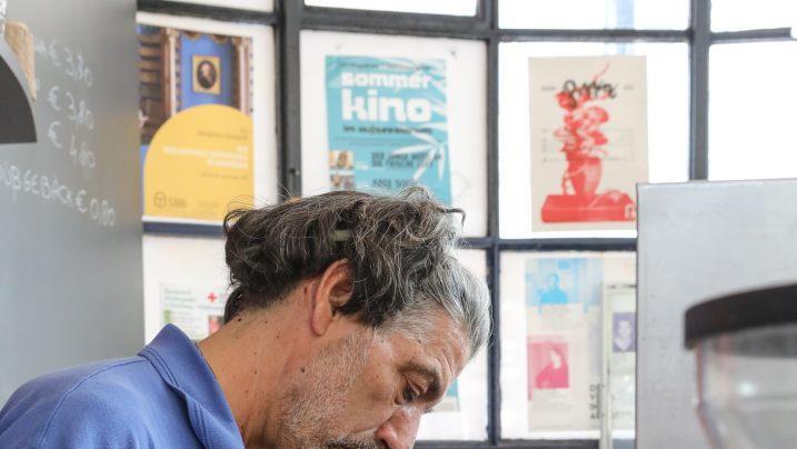 Es ist bei Weitem keine einheitliche Kundschaft, die hier täglich angeregt schwatzt, Kaffee trinkt, Pizza isst und Zeitung liest. An hohen Holztischen in der Sonne stehen Männer im Anzug und im Blaumann, junge Eltern mit Babys auf dem Arm, Studenten, Rentner. Unter ihnen Adolf Singer: Jeden Morgen kommt er vorbei, seit 25 Jahren. Und das nicht nur, um guten Kaffee zu trinken. "Ich genieße die Gesellschaft hier. Es kommt jeder her, vom Obdachlosen bis zum Gerichtspräsidenten." Während des Interviews grüßt er im Minutentakt andere Gäste. "Das war meine Friseurin. Und der war mit meiner Tochter in der Schule", erklärt er.