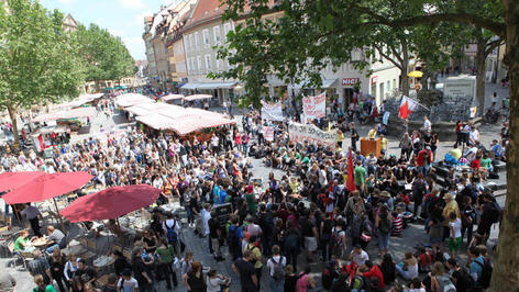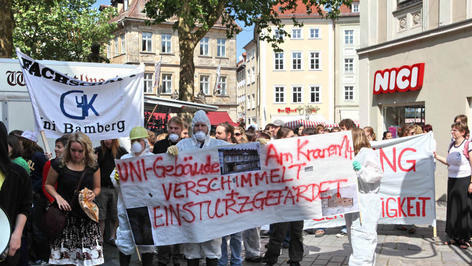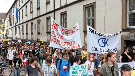 Einen denkwürdigen Tag haben sich die Bamberger Schüler und Studenten für ihren gestrigen Bildungsstreik ausgesucht: Gingen doch schon vor 56 Jahren erstmals die Bürger der DDR auf die Straßen, um für Freiheit zu kämpfen. Insgesamt zogen am Vormittag rund 700 Schüler und Studenten durch die Innenstadt von Bamberg, um für ein besseres und vor allem kostenfreies Bildungssystem sich stark zu machen. Und dies obwohl es den Schülern, nach vorsichtigen Schätzungen bestand mehr als die Hälfte der Demonstranten aus Schülern, verboten war, während der Unterrichtszeit ihre Meinung zu äußern.