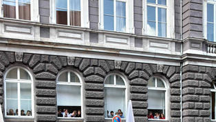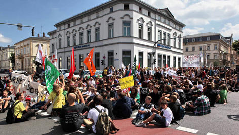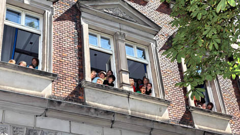 SitzstreikAm Schönleinsplatz gab es dann wie bei den Fanfeiern der Fußballweltmeisterschaft einen dreiminütigen Sitzstreik, ehe es dann durch die Lange Straße zum Clavius Gymnasium und dann weiter zur Maria Ward Schule ging.