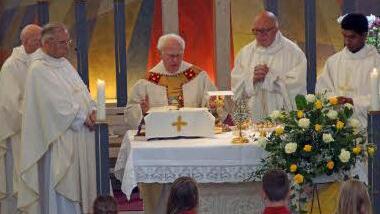 Dementsprechend gut besucht war auch die Pfarrkirche St. Peter und Paul. Zusätzliche Stühle waren aufgestellt, um alle Besucher unterzubringen. Neben Pfarrer Schmitt und Pater Placidus zelebrierten auch Prälat Klemens Fink (er war Studienkollege von Pfarrer Schmitt), Pater Charles und Pfarrer Josef Eckert.