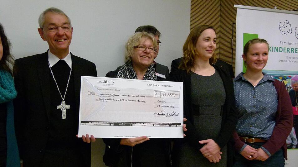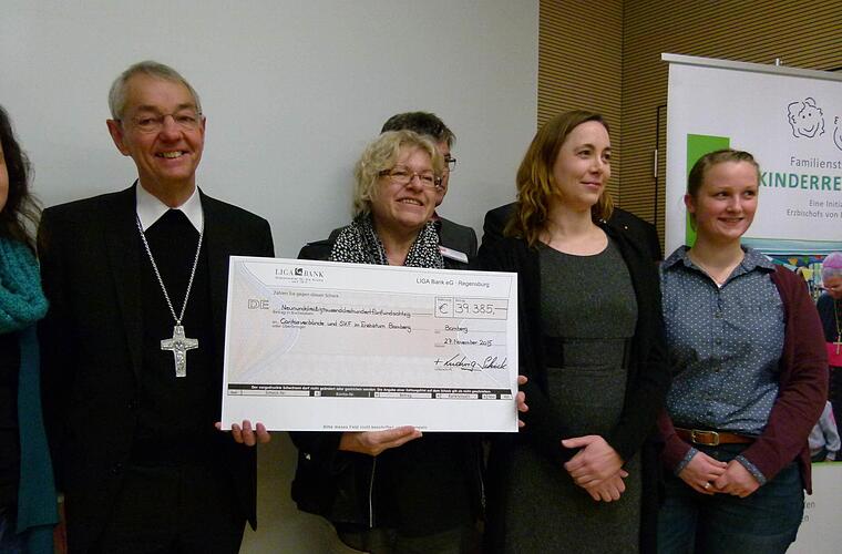 Die Familienstiftung "Kinderreich", die Erzbischof Ludwig Schick gegründet hat, schüttete fast 40 000 Euro aus. Die Scheckübergabe fand im Rahmen eines Fachgesprächs mit Caritas-Mitarbeitern aus dem ganzen Erzbistum statt.