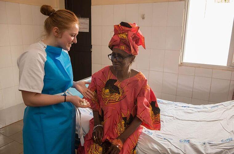 Behutsam umfasst Judith Schmitt das Handgelenk der älteren Patientin, fühlt ihren Puls. "Die Vitalzeichen sind in Ordnung", erklärt die 18-Jährige kundig. Kein Wunder, denn schon einige Zeit lang absolviert die Stegauracherin ihr Pflichtpraktikum vor dem Medizinstudium in diesem Krankenhaus: im Hopital St. Jean de Dieu in Thiès/Senegal. "Judith macht ihre Sache sehr gut!", lobt auch Krankenhausdirektor Frater Brice Luc Ouendo. Er freue sich darüber, dass die Diözesanpartnerschaft zwischen Thiès und Bamberg seinem Haus immer wieder junge Mitarbeiterinnen aus Deutschland ermögliche.