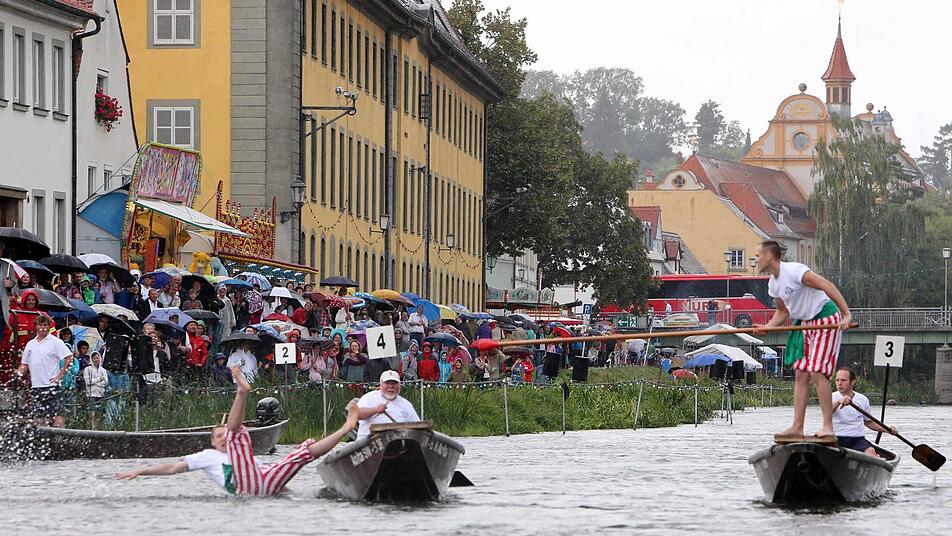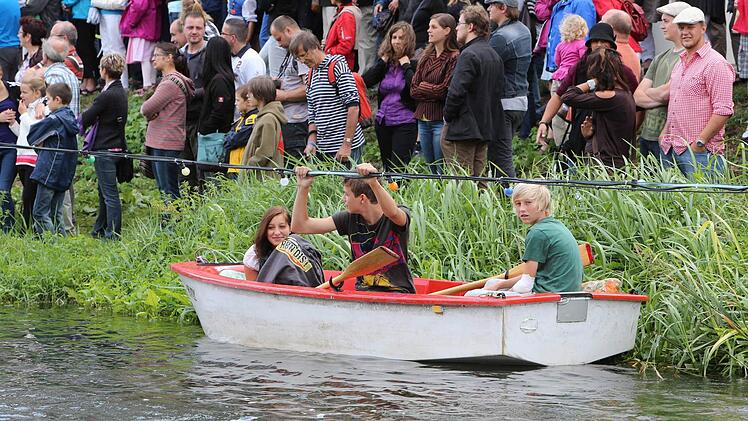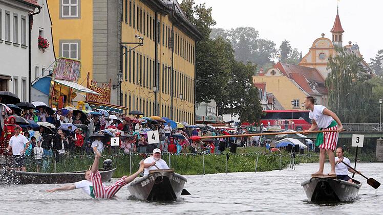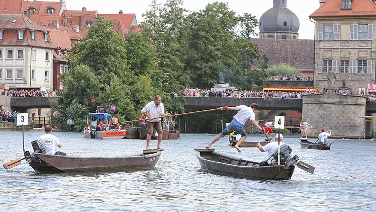 Sie schenkten sich nichts:   der Bamberger Dominik Kropf   und sein Gegner im Fischerstechen-Finale,  Titelverteidiger Hans Angerer  aus  Schliersee.  War   der erste Kampf heute  Nachmittag auf der Regnitz schon nach   wenigen Sekunden vorbei  gewesen,  dauerte die  entscheidende Begegnung    zwischen ihnen 15 Minuten.