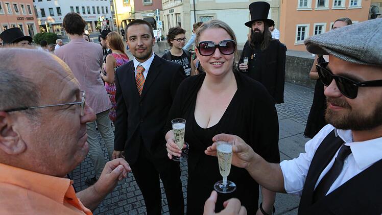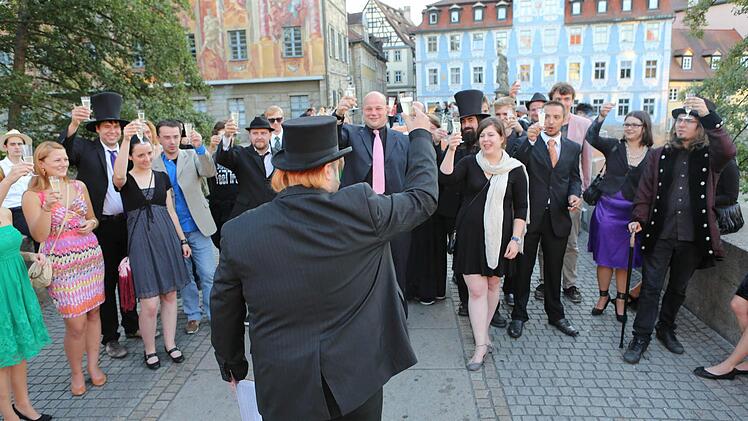 Das ist nicht bei jedem der etwa 30 Menschen so, die dem Aufruf zum "Flashmob" - eine relativ spontane Ansammlung von Leuten - gefolgt sind. Wer in Abendgarderobe gekleidet erschienen war, erhielt ein Glas Sekt. Mit der Aktion wollte die Piratenpartei gegen das Alkoholverbot in der Bamberger Innenstadt demonstrieren. "Wir wollen das Thema präsent halten", sagte Benjamin Stöcker, Landtagskandidat für die Piratenpartei Bamberg-Stadt.