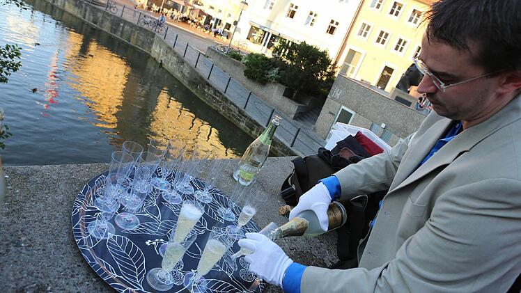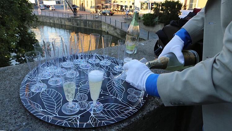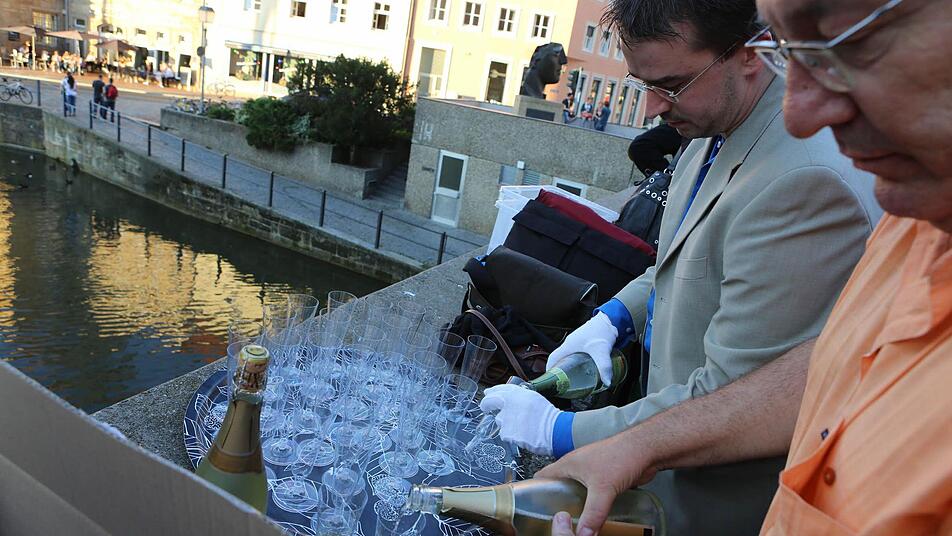 Die Piratenpartei schenkte Donnerstagabend an alle Sekt aus, die in Abendgarderobe auf die Untere Brücke kamen. Mit der Aktion möchte die Partei gegen das Alkoholverbot in der Bamberger Innenstadt demonstrieren.