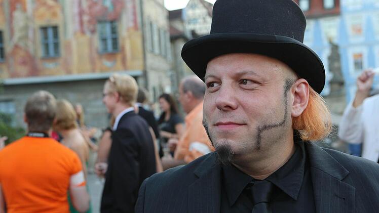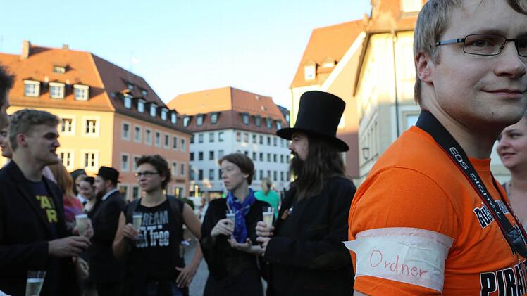 Klaus steht erhaben auf der Unteren Brücke, der hohe Zylinder thront auf dem Kopf, der Anzug sitzt, die Haltung ganz im Stil eines englischen "Sir". Ist er eigentlich "Pirat", schließlich hat doch die Bamberger Piratenpartei zu der Versammlung in schicker Abendgarderobe geladen. "Nein", sagt Klaus, Mitglied der Partei sei er nicht. Aber er will sie im Landtag sehen.