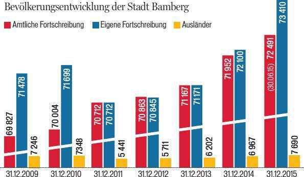 Die eigene Fortschreibung der Zahlen durch die Bamberger Verwaltung ist aktueller: Zum 31. Dezember 2015 sollen bereits 73 352 Menschen in Bamberg gelebt haben.